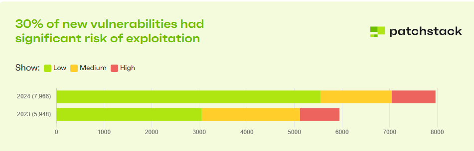 In 2024, 7,966 new vulnerabilities were found in the WordPress ecosystem, primarily in third-party plugins. That’s a 34% increase over 2023. While the majority of vulnerabilities don’t pose an active risk, high priority vulnerabilities were also up 11% year on year.