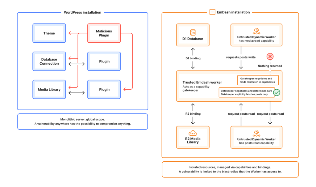 Este modelo también rompe la dependencia de los marketplaces centralizados. Los plugins de EmDash pueden tener cualquier licencia. Pueden correr de forma completamente independiente del CMS. Y dado que el sandbox hace imposible que un plugin actúe fuera de sus permisos declarados, la comunidad puede confiar en plugins sin que un marketplace centralizado los valide primero.